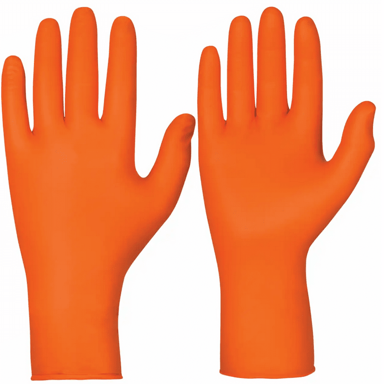 Nitrilgummi, puderfria. Färg: Orange. Längd: 27 cm. Starka och elastiska. Mikroruggad ytstruktur för bättre grepp. Beständighet mot fett, rengöringsmedel, kemikalier (EN 374). Godkända för användning i direkt kontakt med alla typer av livsmedel, inklusive livsmedel med hög fetthalt (EN 1186). Godkända för medicinsk användning (EN 455). Testad enligt ASTM D6978-05 - Resistance of Medical Gloves to Permeation by Chemotherapy Drugs. Vikt 7,2 ± 0,5 g.