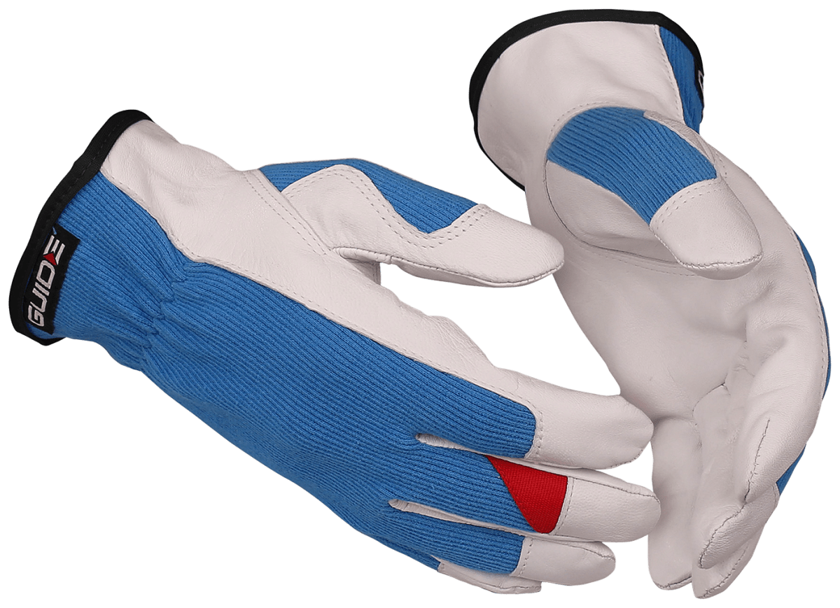 Guide 5164 är en montagehandske med en handflata i tunt och mjukt getläder som tål lite gniststänk. Ovanhanden är tillverkad i bomull och handsken har keystone-tumme för optimal flexibilitet. Den öppna kragen och resår vid handleden gör handsken enkel att ta på och av och optimerar passformen. Lämplig för bygg, industri och hantverk samt för lager-, pack- och plockarbeten.