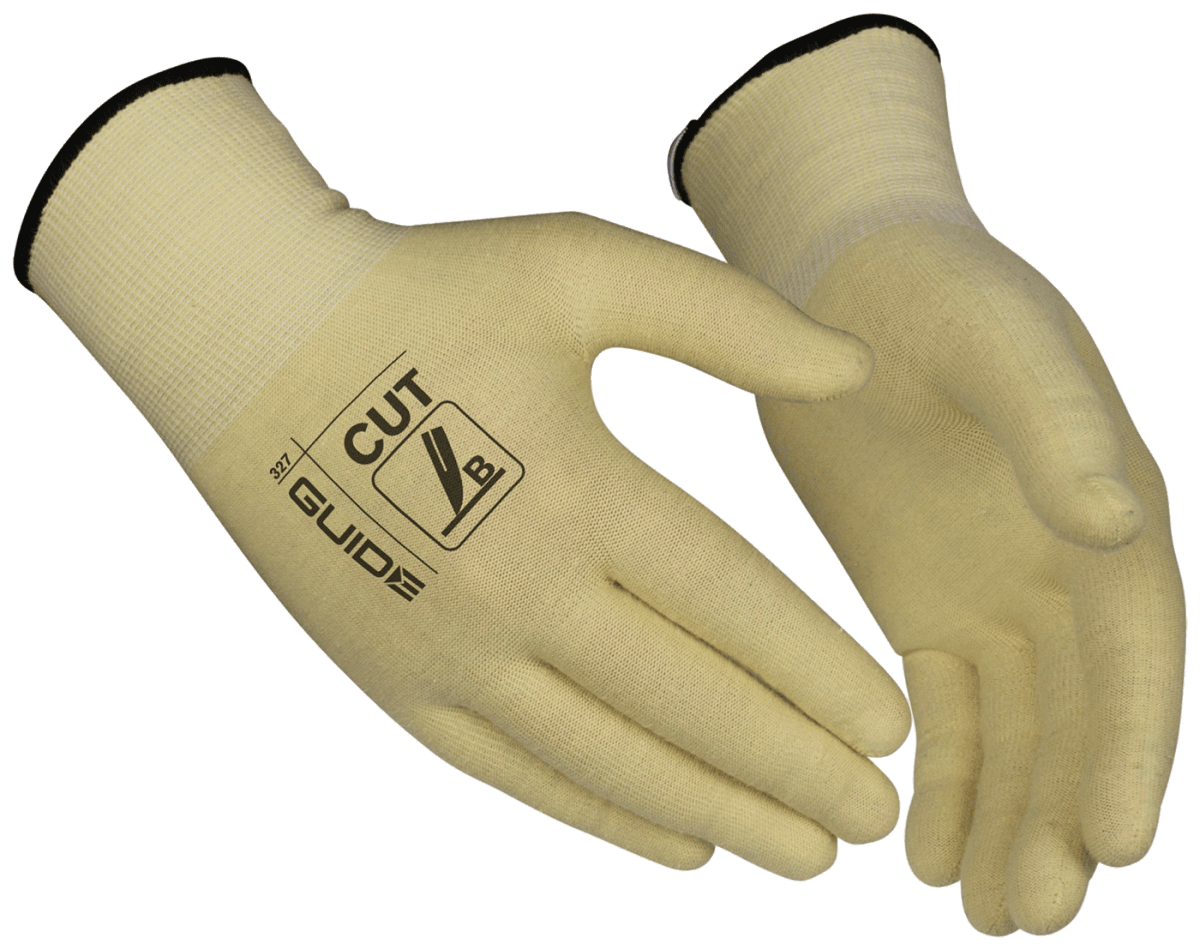 Guide 327 är en tunn skärskyddshandske i en stickad i fiberblandning av Kevlar/metall/polyester/bomull med en mjuk komfort. Är lämplig som skyddande innerhandske.