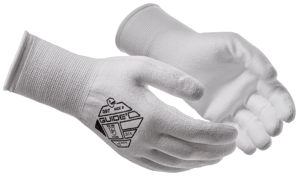 Guide 397 är en skärskyddshandske med slät ytstruktur och tight passform. Handflatedoppad i PU. Bra grepp och fingertoppskänsla. För allround arbete. Skärskyddsnivå B. Öko-tex certifierad. Godkänd för kontaktvärme nivå 1.