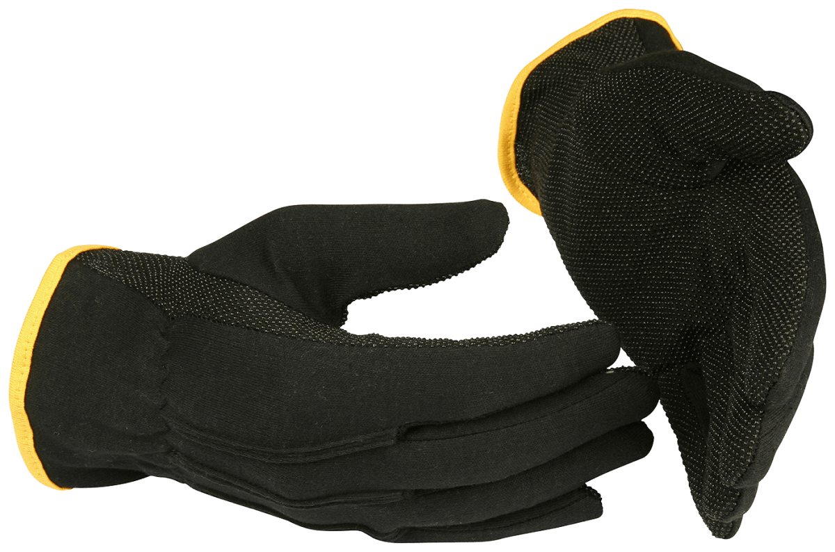 Guide 547 är en tunn och smidig arbetshandske stickad i svart bomullstrikå. Bomull tar lätt upp fukt och är bra på att leda bort överskottsvärme, materialet känns därför behagligt mot huden. Innerhanden har en beläggning av PVC-punkter för bättre grepp och slitstyrka. Resår vid handleden gör att handsken sitter på plats och färgmarkeringen vid krage anger storlek. Tillverkad av silikonfria material. Lämplig vid montering-, plock- och packarbeten.