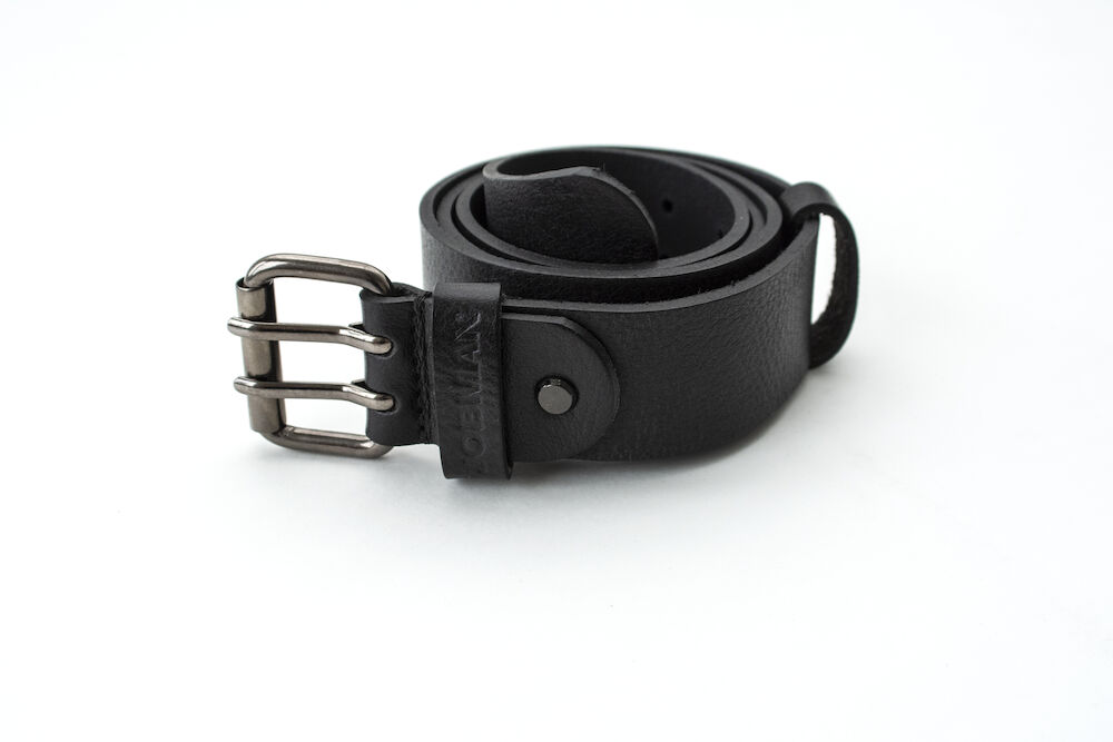 Bälte i läder, 36 mm brett. Kraftigt spänne med stålstift.