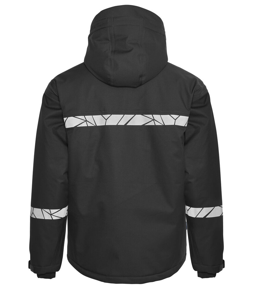 Projob 7413 fodrad jacka i funktionellt softshellmaterial som är vind- och vattenavvisande. Dragkedjan framtill har en utvändig vindslå för att förhindra vinddrag samt att vatten tränger in, försluts med tryckknappar. Bröstficka på höger sida med invändigt fäste för id-kort, samt sidfickor på båda sidor med invändigt fleecefoder, försluts med dragkedja. Innerfickor på båda sidor som försluts med kardborre. Förlängd i rygg. Avtagbar huva, justerbar med dragsko. Reglerbara ärmslut med kardborre, även en invändig mudd för att sluta tätt. Justerbar midja med dragsko. I den inre vänstra sidosömmen finns en tvättchipficka.