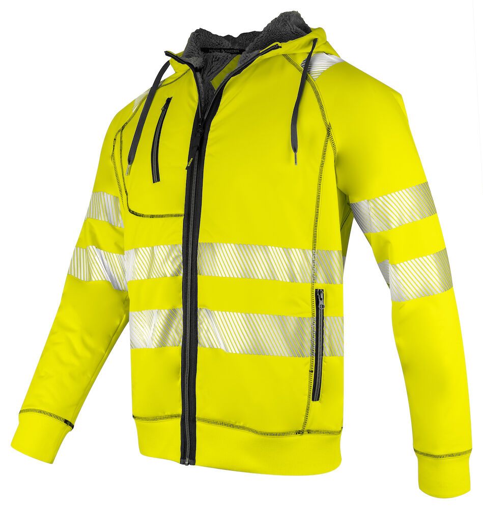 Hoodjacka med pälsfiber, pilé, på insidan vilket gör tröjan extra varm. Utsidan av jackan är av tunt, följsamt softshellmaterial som håller vinden ute. Detaljsömmar i kontrastfärg. Sidfickor på båda sidor som försluts med dragkedja. Vertikal bröstficka med dragkedja. Två innerfickor. Reglerbar huva med dragsko. Ribbstickad mudd i nederkant samt ärmslut. Segmenterade reflexer från 3M, även över axlarna.