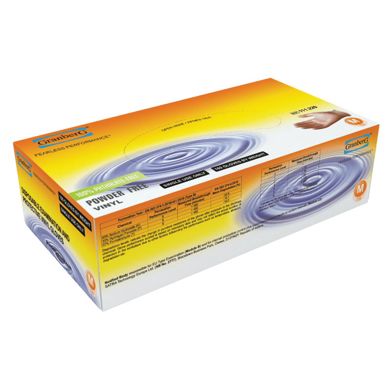 Granberg engångshandskar 111.220. Vinyl, puderfria. Ftalatfria. Lätta att ta på och av. Ger god fingerkänsla. Godkända för Medicinsk användning (EN 455). Silikonfria. Godkända för hantering av livsmedel, dock ej feta livsmedel (EN 1186). Vikt 5.0 ± 0.3 g.