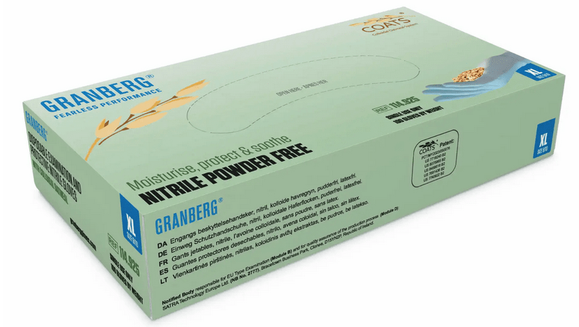 Handskar belagda med kolloidalt havre, nitril, puderfria, duvblå. "Collodial Oatmeal System" (COATS®) handskar har en inre barriär som minskar risken för hudirritation orsakad av uttorkning. Beläggningen kan lindra irritation och minska klåda vilket underlättar läkning. Kolloidalt havre återfuktar huden. Mikroruggad ytstruktur på fingertopparna för bättre grepp. För medicinskt bruk. Testad enligt ASTM D6978-05 - Resistance of Medical Gloves to Permeation by Chemotherapy Drugs. Godkända för användning i direkt kontakt med alla typer av livsmedel, inklusive livsmedel med hög fetthalt (EN 1186). Vikt 3,2 ± 0,3 g.