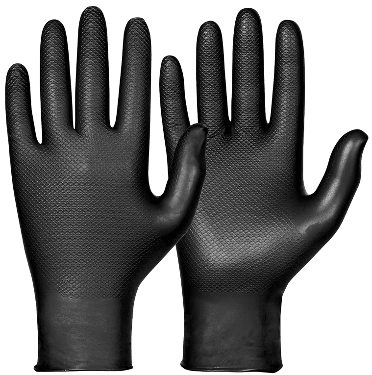 Nitrilgummi, puderfria. Färg: Svart. Fiskfjällsmönster på handskarnas båda sidor för optimalt grepp. Slitstark rullkant på handskarna som gör dem lätta att ta på och av, samt ger utökat skydd mot spill och dropp från kemikallier. Kemikalieresistenta och oljebeständiga (EN 374). Vikt 7,4 ± 0,3 g.
