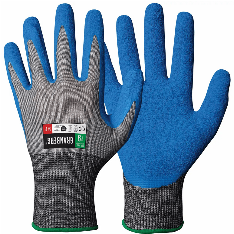Granberg 116.530 är skärskyddshandskar med 15-gauge väv av Typhoon® HPPE ger utmärkt skärskydd (nivå E) och lämpar sig för hantering av glas, metall och plast. Skrynklad latexbeläggning säkerställer bra torr- och våtgrepp. Ventilerande material ger gor komfort och fingerkänsla (nivå 5). Skyddar mot kontaktvärme upp till 100°C i 15 s. OEKO-TEX® 100-godkända.
