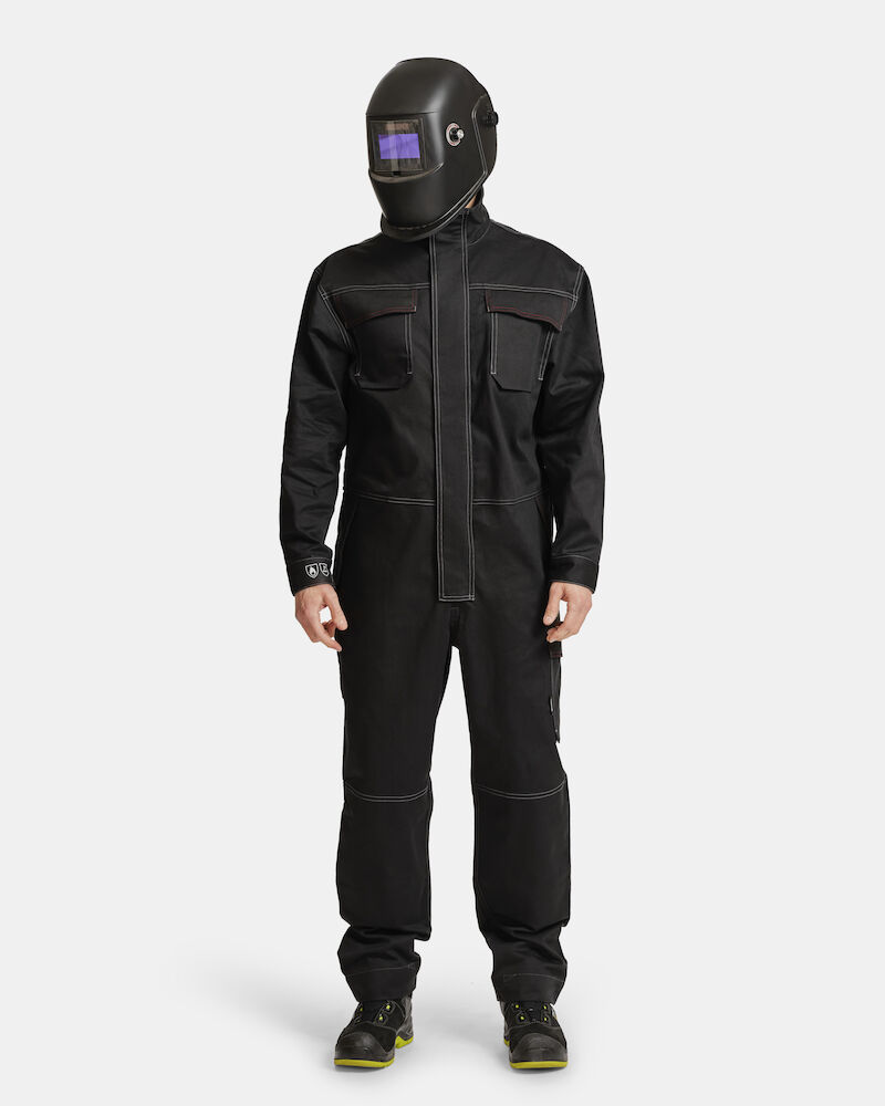 Overall, flamskyddad i 350 g bomull, Proban behandling. Certifierade enligt standard EN11612 och EN11611. Ficklösningar och funktioner är speciellt anpassade för svetsning. Tvåvägs blixtlås med vindslå upp i kragen. Bröstfickor med bälg och ficklock. Innerficka med telefonfack. Bakfickor med bälg och ficklock. Tumstocksficka med ficklock, lös nederkant och extrafack. Benficka med ficklock. Invändiga knäskyddsfickor. Reglerbar midja och ärmavslut. Byxbenet kan förlängas med 5 cm genom ett utvik i benslutet.
