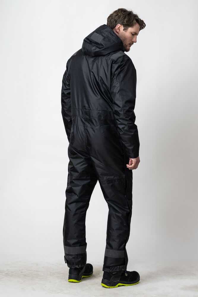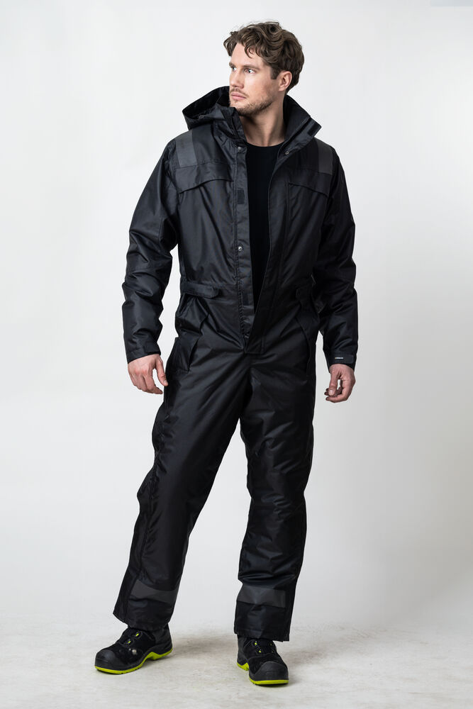 Varmfodrad quiltad, vind- och vattentät overall med tejpade sömmar. Påvärmda Jobman reflexer över axlar och benavslut för ökad synbarhet. Bröstficka fram, höger sida + Napoleonficka under vindslå fram. Stolpfickor fram. Reglerbar med kardborre i ärmavslut och nederkant ben. Huva med dragsko som är avtagbar med tryckknappar. Blixtlås i sidosömmarna från höften och ned.