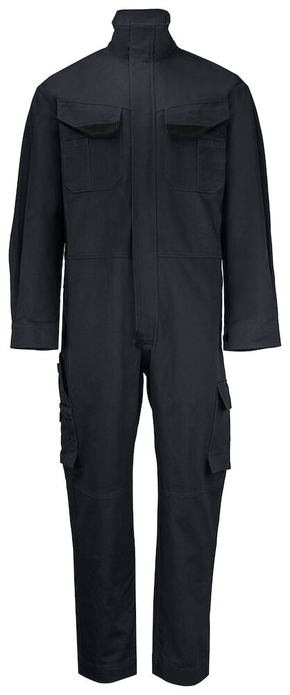 Overall med tvåvägsdragkedja upp till kragen framtill. Djupa sidfickor, även öppningar i sidorna för att komma åt fickor i byxorna under. Bröstfickor på båda sidor med plats för pennor, papper etc den vänstra med fäste för id-kort, fickorna försluts med kardborre. Verktygsficka med knivknapp. Tumstocksficka. Reglerbar midja med invändig resår. Bakfickor, försluts med kardborre. Invändiga knäskyddsfickor.