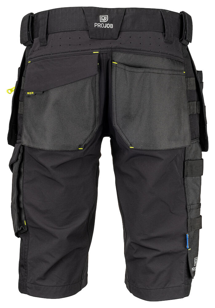 Shorts i fullstretch för maximal rörelsefrihet. Modern passform. Sidorna upptill är inte i stretch för att ge stadga åt shortsen. Hängfickor med Cordura®förstärkt insida, varav den ena med dragkedja. Hängfickorna går att ta av genom att sprätta en kontrastfärgad, dold tråd. Ventilation bak i midjan. Benfickor, på vänster sida med plats för verktyg och penna, även en mobilficka med magnetlås samt fäste för ID-kortshållare. På höger sida tumstocks- och verktygsficka med knivknapp. Fästen för verktygshållare. Bakfickor i Cordura®, den ena med lock med magnetlås. Möjlighet att fästa MOLLE- system på båda sidor.